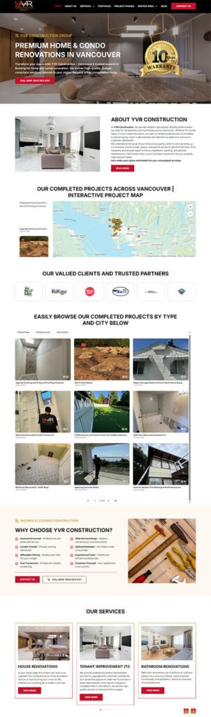 A conversion-focused WordPress build with Elementor Pro showcasing residential renovations across Vancouver. The mobile-first design emphasizes trust and